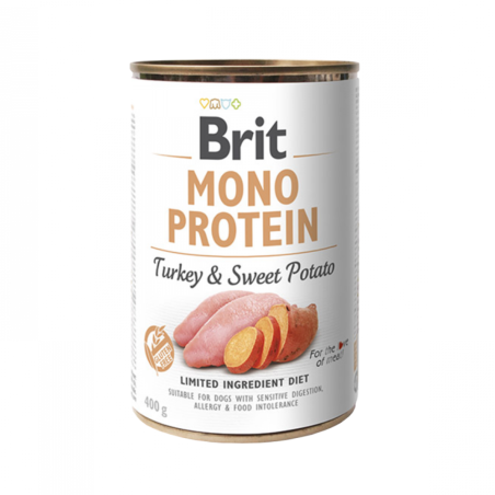 Proteína de pavo 100% pura con batatas. Brit Mono Protein proporciona una nutrición completa y equilibrada. Su fórmula se basa en un solo tipo de proteína y es ideal para reducir el riesgo de alergias e intolerancias alimentarias.