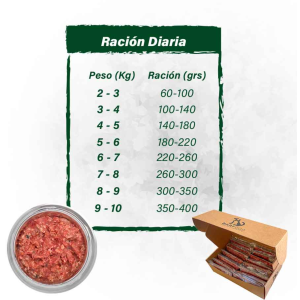 Ingredientes: Carne de Pavo, interiores de pavo, hueso carnoso de pollo finamente molido, acelga, brócoli, zanahoria, arándano, vitaminas y minerales.